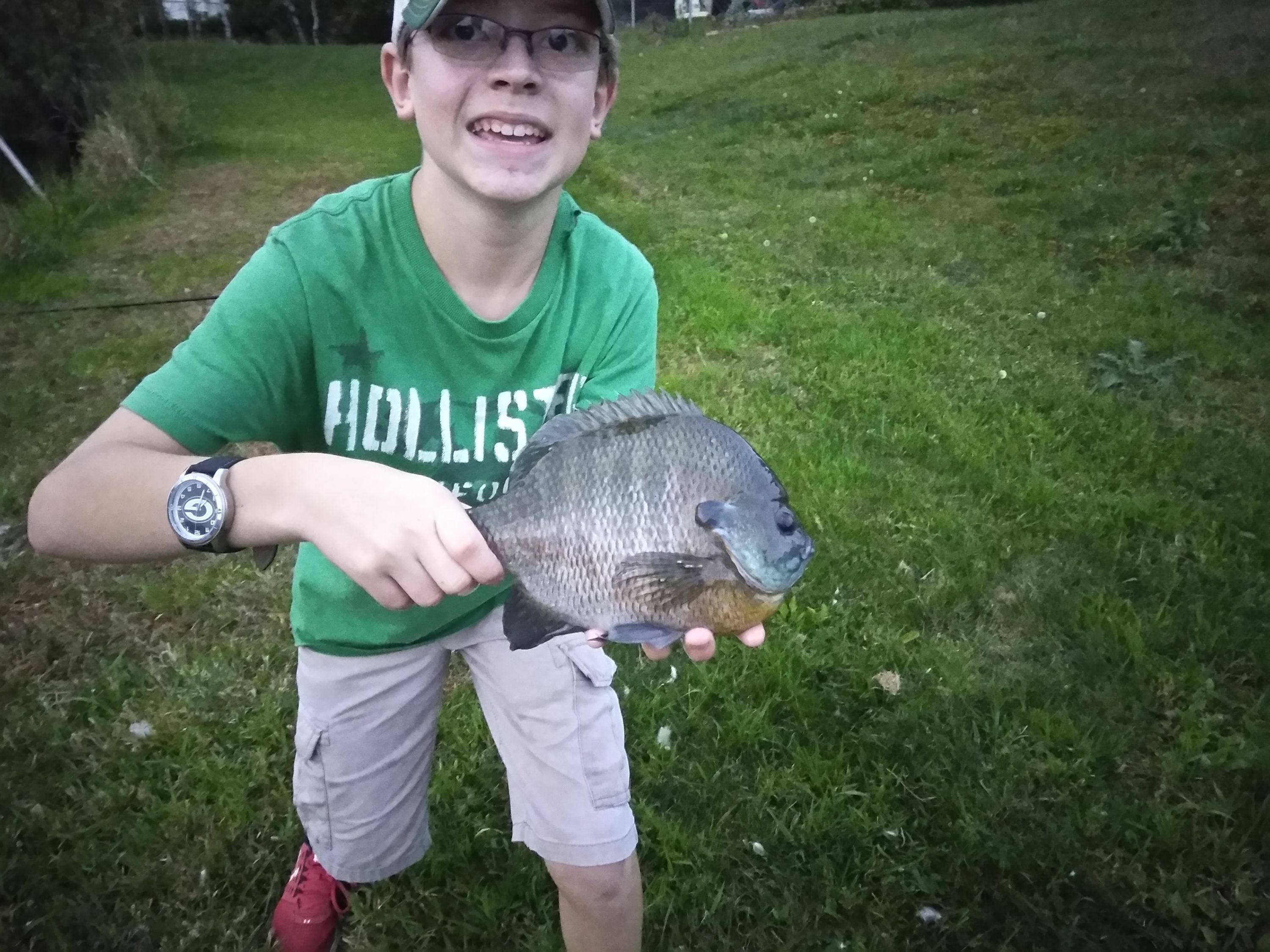 - Catch Story: Aidan was fishing in the pond in our backyard when this monster bit on a minnow head. It fought really hard for a couple of minutes before he was able to land it. He was super excited and amazed that it came from our pond.