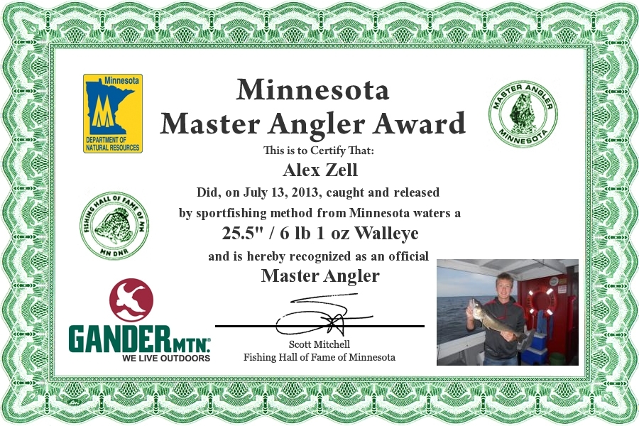 Alex Zell did, on July 13, 2013, caught and Released by sportfishing method from Minnesota waters a 25.5" / 6 lb 1 oz Walleye and is hereby recognized as an official Minnesota Master Angler.