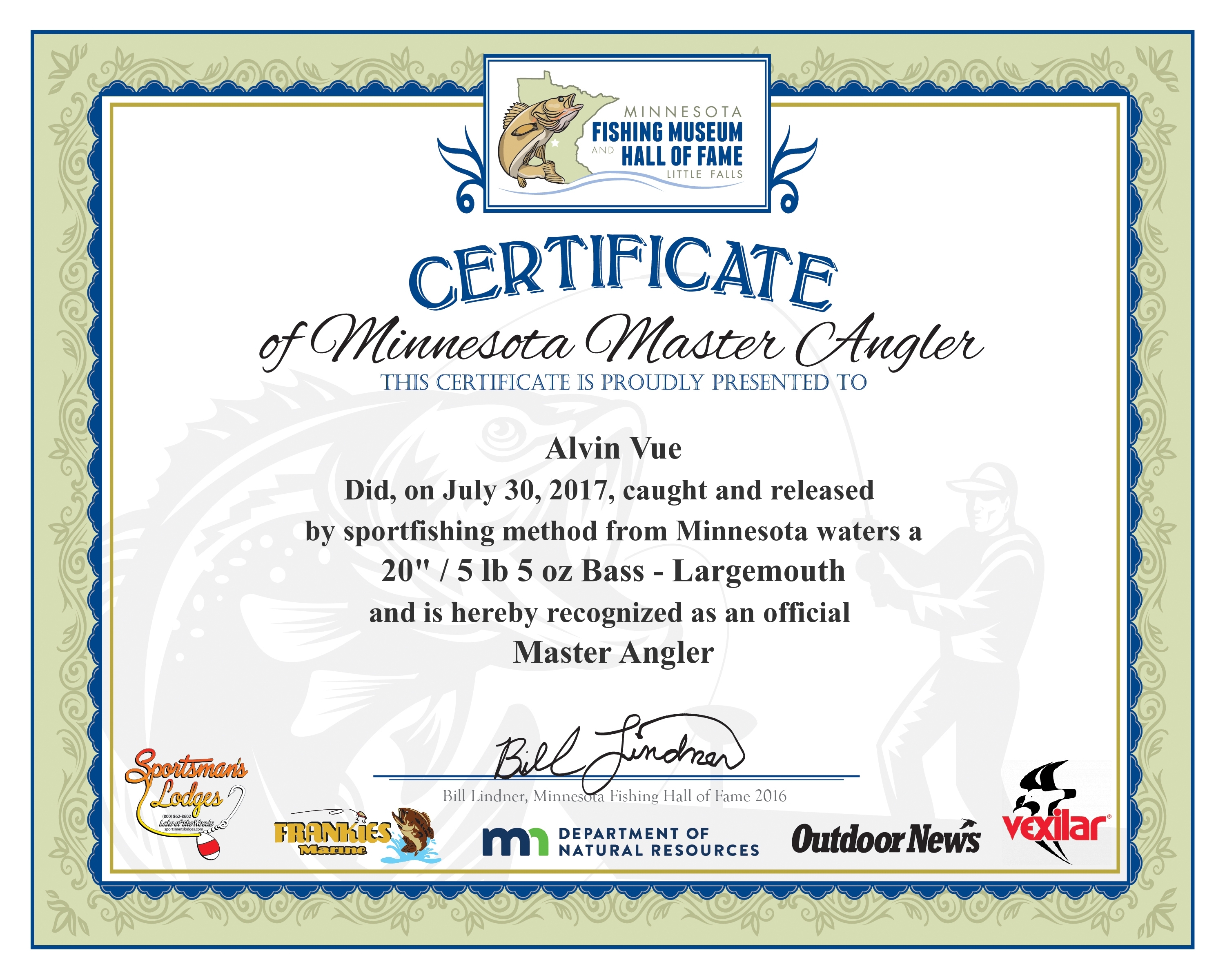 Alvin Vue did, on July 30, 2017, caught and Released by sportfishing method from Minnesota waters a 20" / 5 lb 5 oz Bass - Largemouth and is hereby recognized as an official Minnesota Master Angler.