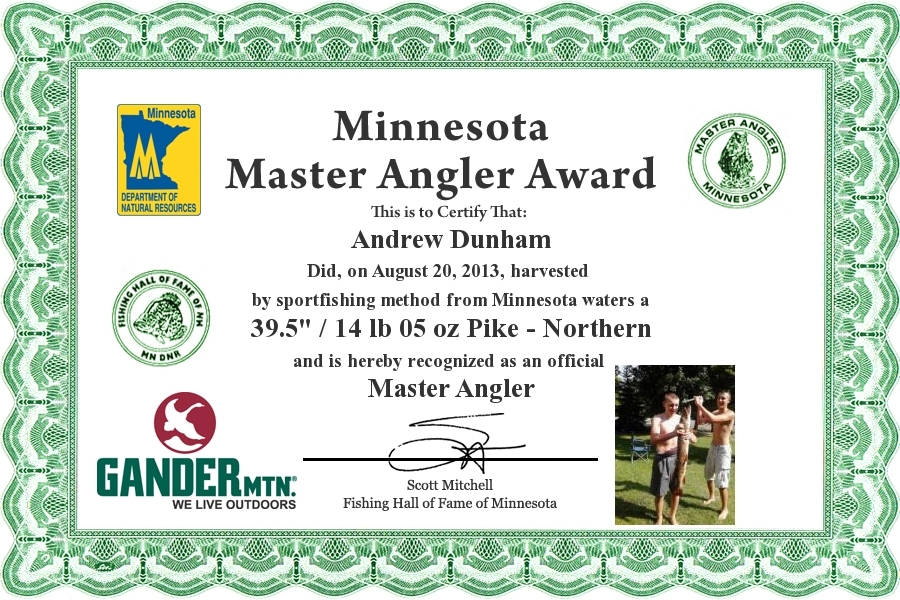 Andrew Dunham did, on August 20, 2013, caught and Harvested by sportfishing method from Minnesota waters a 39.5" / 14 lb 05 oz Pike - Northern and is hereby recognized as an official Minnesota Master Angler.