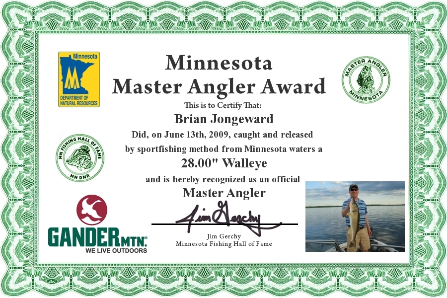 Brian Jongeward did, on June 13, 2009, caught and Released by sportfishing method from Minnesota waters a 28.00" Walleye and is hereby recognized as an official Minnesota Master Angler.