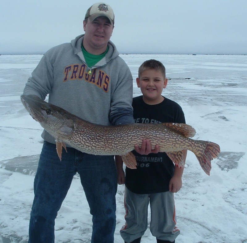 - Catch Story: The 47" nothern was caught in 13' of water on Upper Red Lake MN out of Morts Dock. It was caught on a HT Ice Rigger Tip up holding a 42" Thorne Bros Laker rod with a quick strike rig and a 8" live sucker and a Strike Sensor alarm as we were angling inside teh wheel house for walleye. Dan was accompanied by his nephew (in picture)and dad (taking picture). Fish was fought maybe 10 minutes landed high fives all around fish was measured pictures taken (but not with Dan's Blackberry as it got dropped down a hole in all the excitment)after a brief discussion of getting a mount done a replica was agreed on but then tape could not be found to measure girth so fish was released. It was a great memory with family that will be remembered forever.