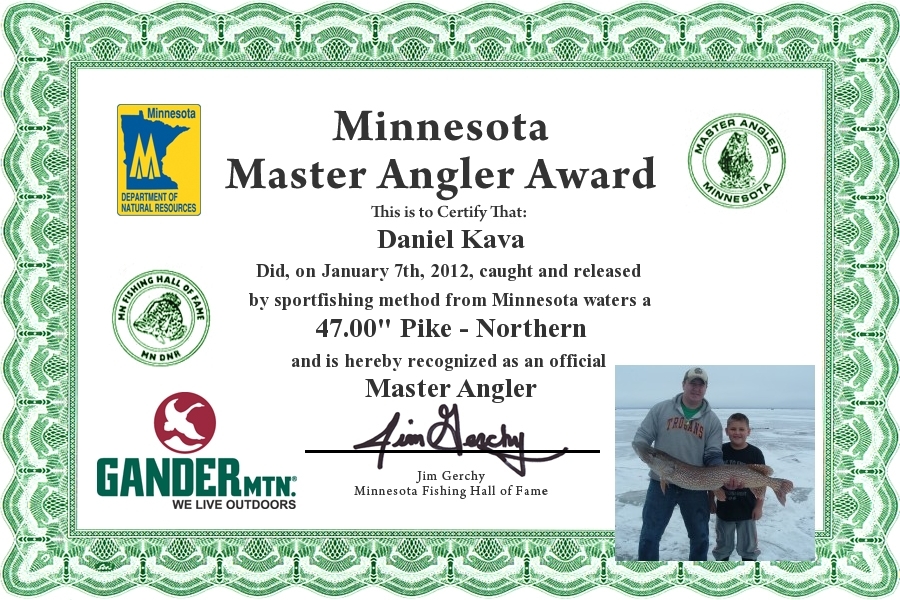 Daniel Kava did, on January 7, 2012, caught and Released by sportfishing method from Minnesota waters a 47.00" Pike - Northern and is hereby recognized as an official Minnesota Master Angler.