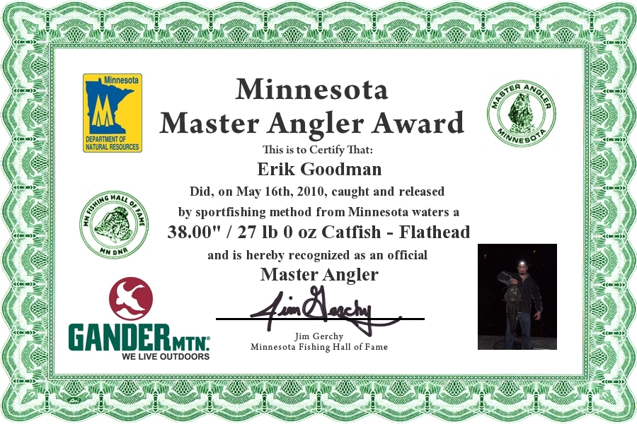 Erik Goodman did, on May 16, 2010, caught and Released by sportfishing method from Minnesota waters a 38.00" / 27 lb Catfish - Flathead and is hereby recognized as an official Minnesota Master Angler.