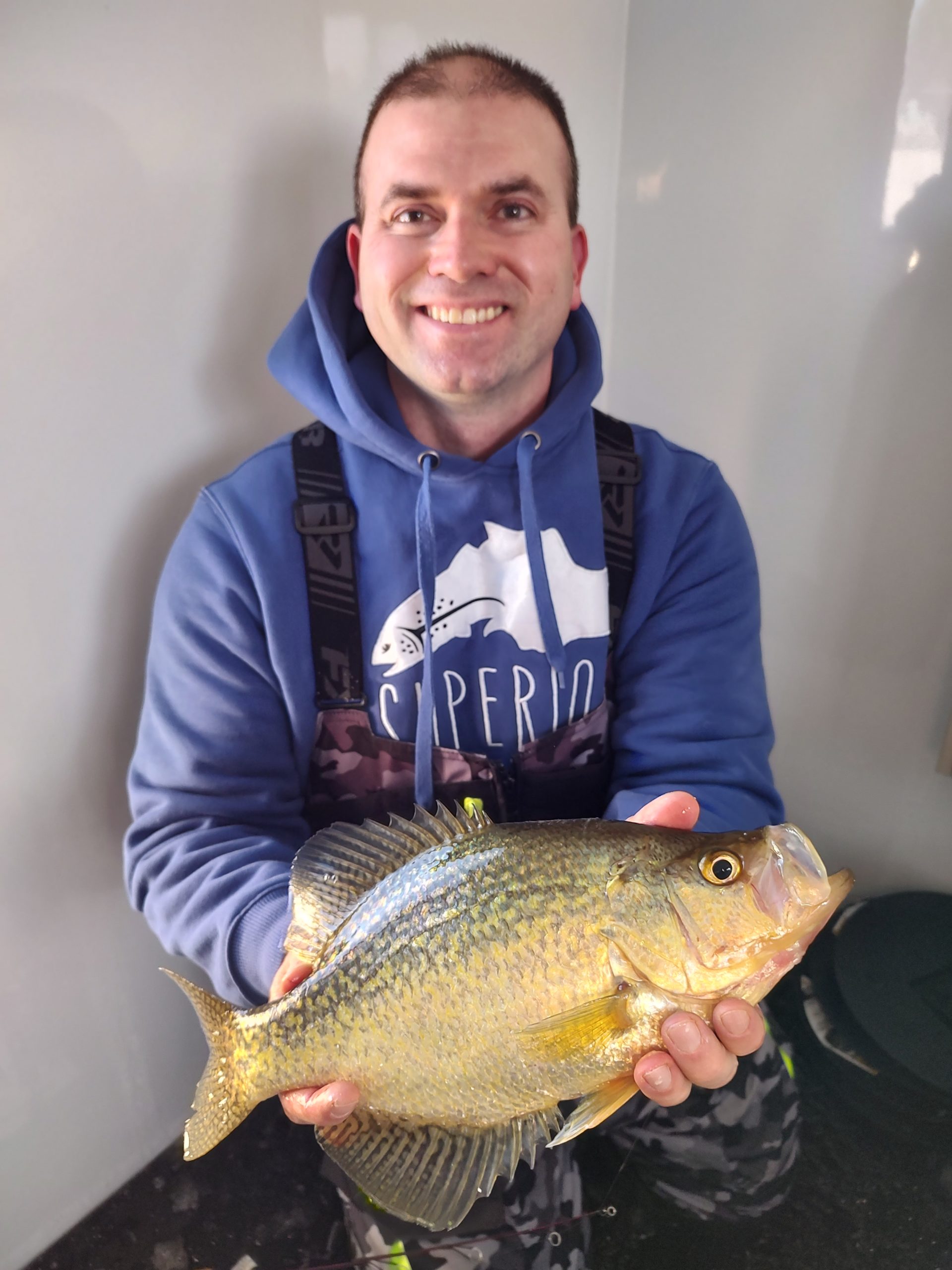 - Catch Story: While jigging for Walleye and Crappie in my friend's ice house, this Crappie inhaled my jig. After a nice fight, measurement, and a few pics, I released it back into the lake.