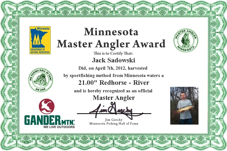 Jack Sadowski did, on April 7, 2012, caught and Harvested by sportfishing method from Minnesota waters a 21.00" Redhorse - River and is hereby recognized as an official Minnesota Master Angler.