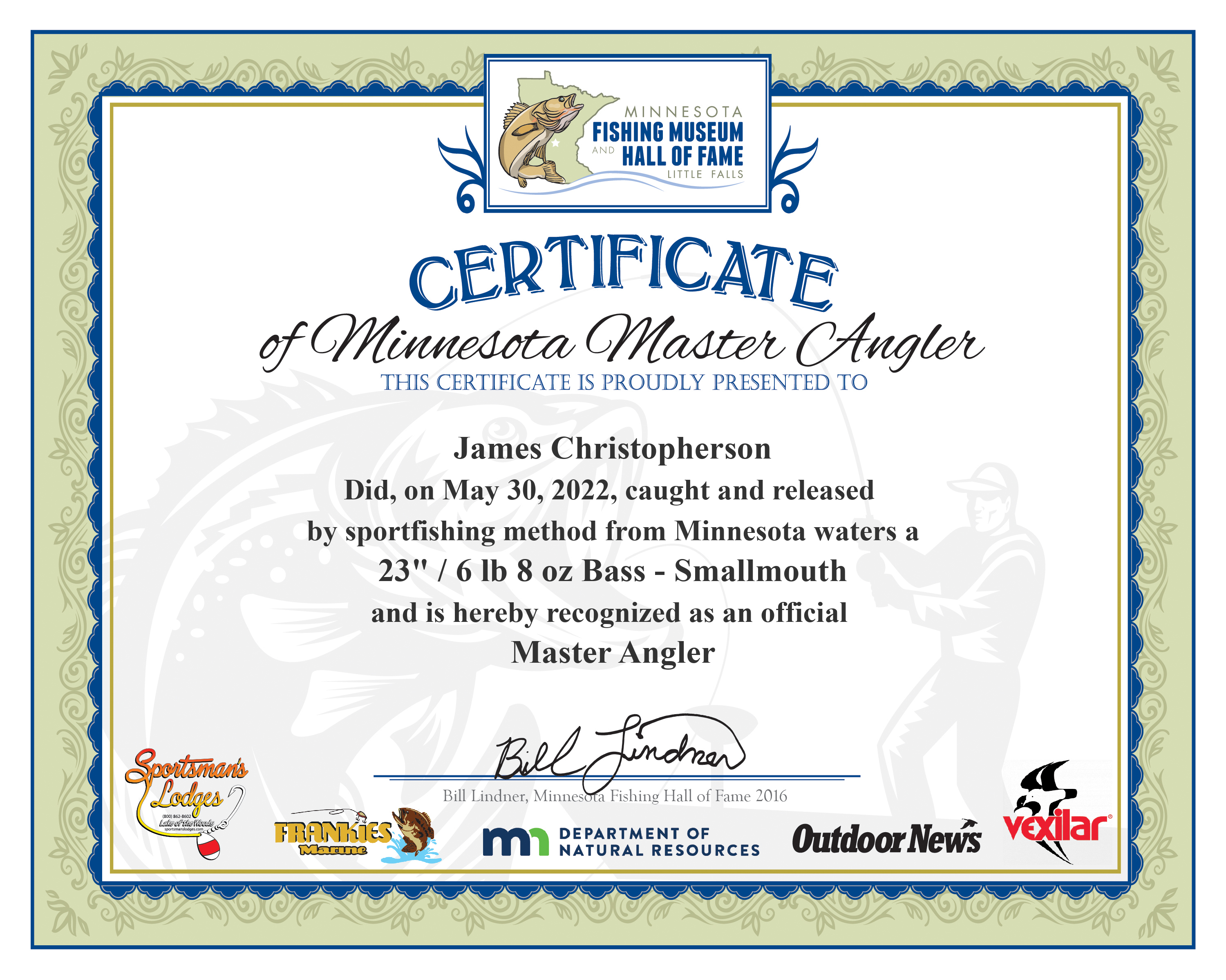 James Christopherson did, on May 30, 2022, caught and Released by sportfishing method from Minnesota waters a 23" / 6 lb 8 oz Bass - Smallmouth and is hereby recognized as an official Minnesota Master Angler.