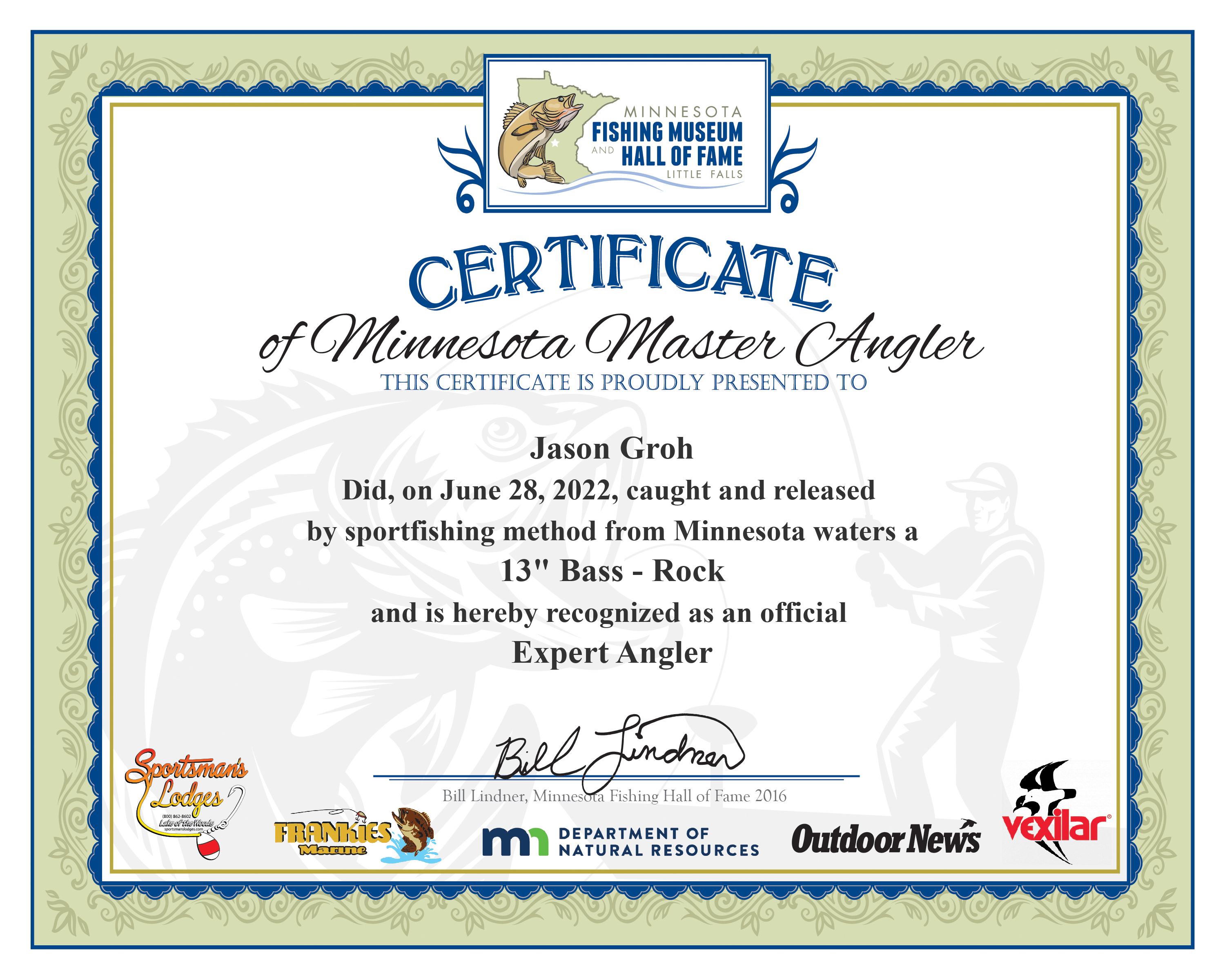 Jason Groh did, on June 28, 2022, caught and Released by sportfishing method from Minnesota waters a 13" Bass - Rock and is hereby recognized as an official Minnesota Expert Angler.