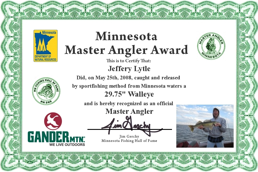 Jeffery Lytle did, on May 25, 2008, caught and Released by sportfishing method from Minnesota waters a 29.75" Walleye and is hereby recognized as an official Minnesota Master Angler.