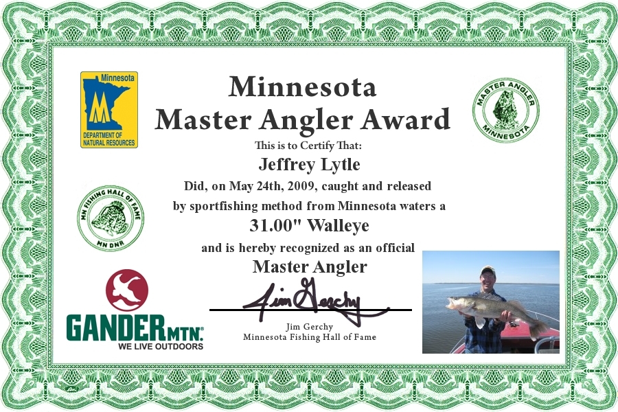 Jeffrey Lytle did, on May 24, 2009, caught and Released by sportfishing method from Minnesota waters a 31.00" Walleye and is hereby recognized as an official Minnesota Master Angler.