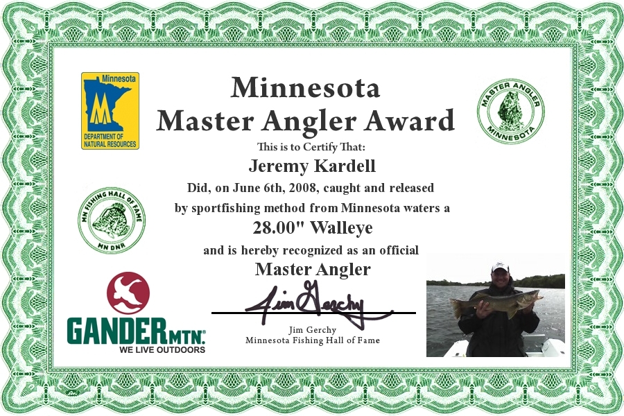 Jeremy Kardell did, on June 6, 2008, caught and Released by sportfishing method from Minnesota waters a 28.00" Walleye and is hereby recognized as an official Minnesota Master Angler.