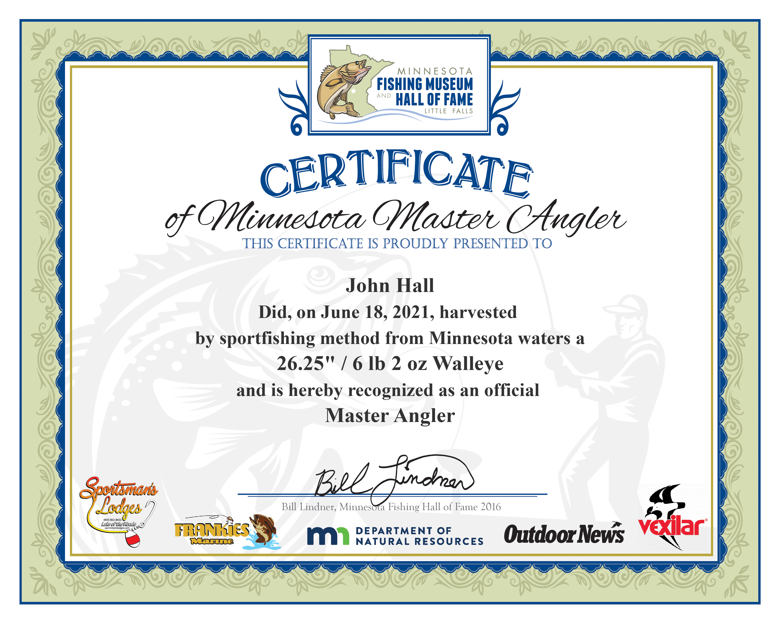 John Hall did, on June 18, 2021, caught and Harvested by sportfishing method from Minnesota waters a 26.25" / 6 lb 2 oz Walleye and is hereby recognized as an official Minnesota Master Angler.