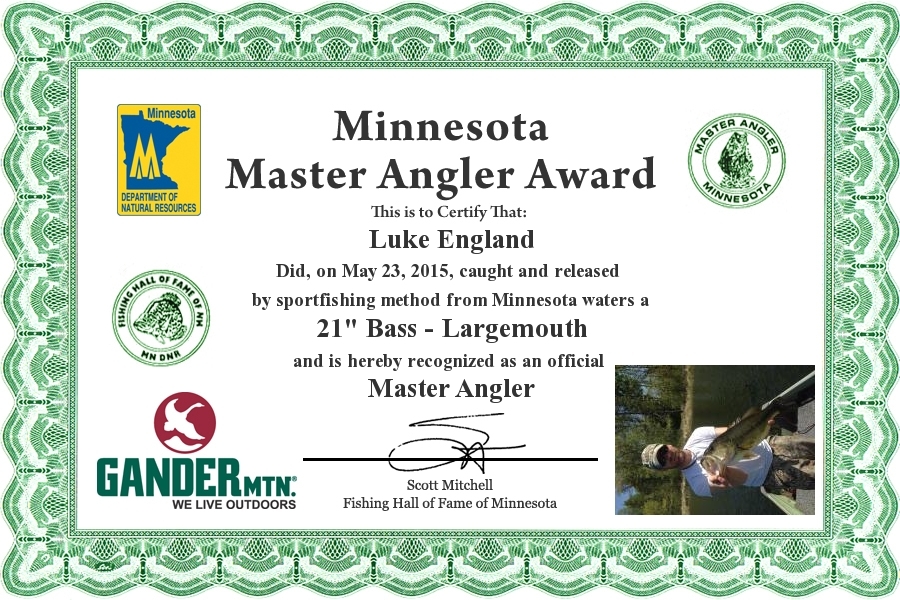 Luke England did, on May 23, 2015, caught and Released by sportfishing method from Minnesota waters a 21" Bass - Largemouth and is hereby recognized as an official Minnesota Master Angler.