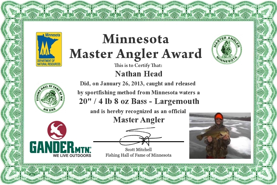 Nathan Head did, on January 26, 2013, caught and Released by sportfishing method from Minnesota waters a 20" / 4 lb 8 oz Bass - Largemouth and is hereby recognized as an official Minnesota Master Angler.