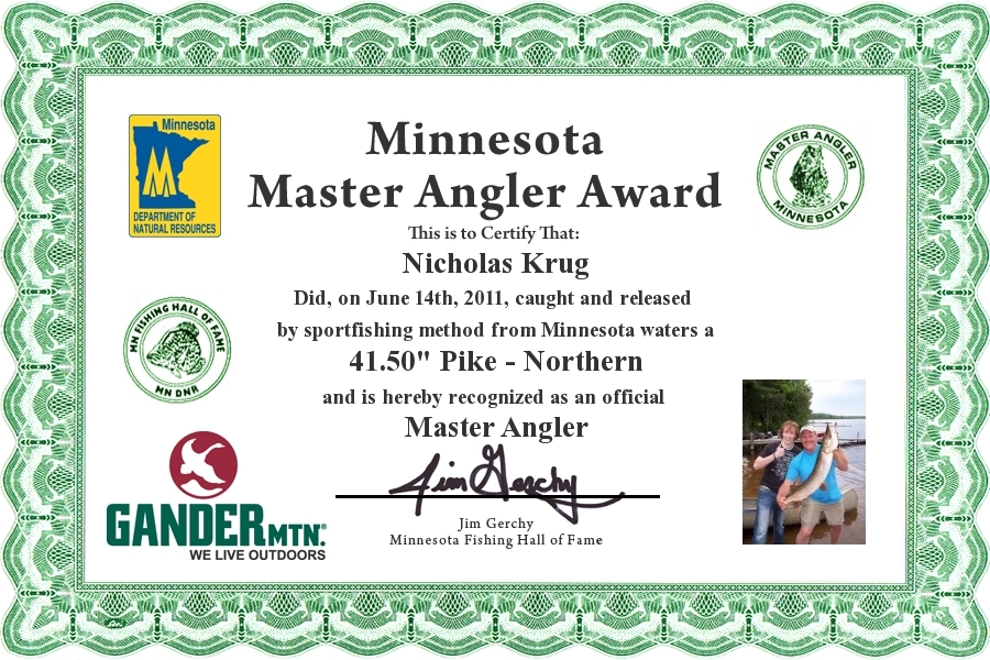 Nicholas Krug did, on June 14, 2011, caught and Released by sportfishing method from Minnesota waters a 41.50" Pike - Northern and is hereby recognized as an official Minnesota Master Angler.