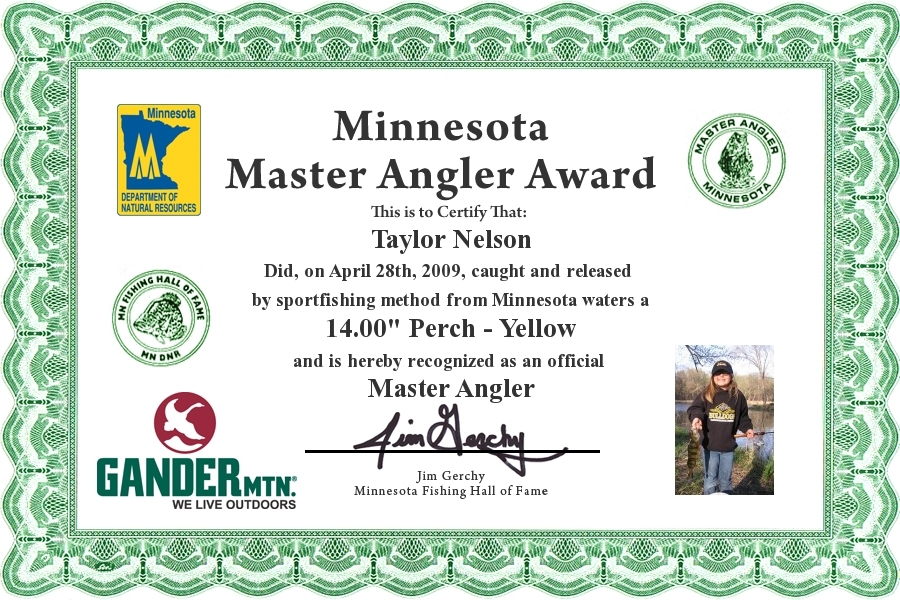 Taylor Nelson did, on April 28, 2009, caught and Released by sportfishing method from Minnesota waters a 14.00" Perch - Yellow and is hereby recognized as an official Minnesota Master Angler.